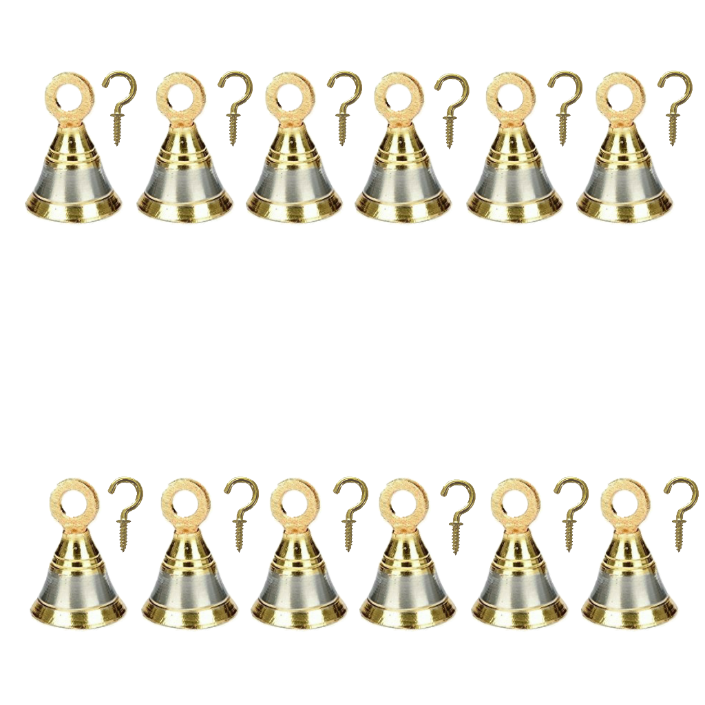 🔔 Experience the timeless elegance and soothing chimes of our meticulously crafted brass Pooja room bells. Each set includes 12 exquisite bells, each adorned with captivating silver and gold finishes, and complemented by gold-plated J hooks.